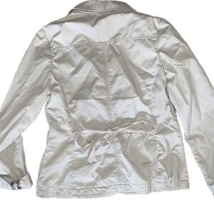 This fitted jacket features a classic silhouette with a notched lapel collar and long sleeves that can be rolled as pictured. The lightweight fabric is perfect for spring.