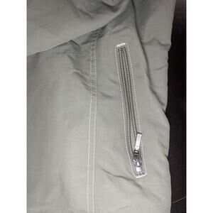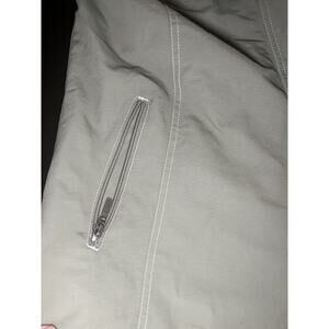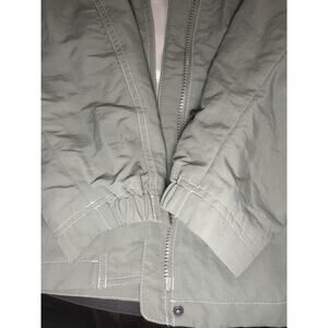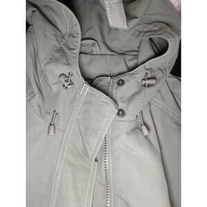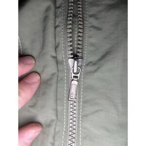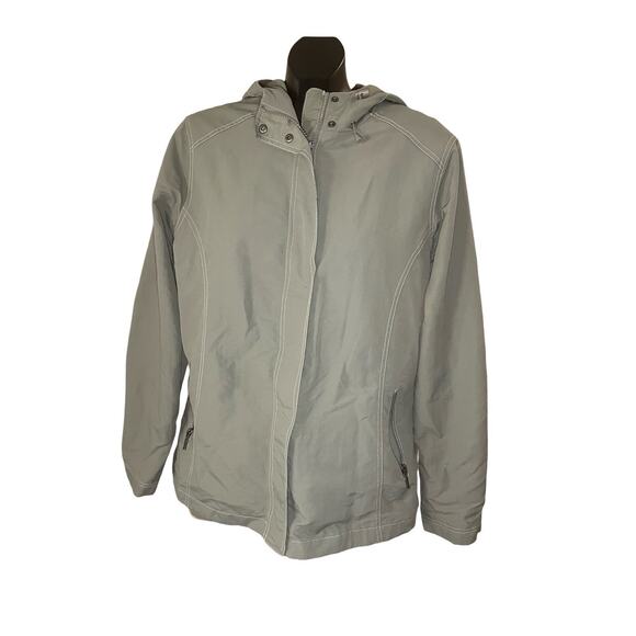 Stay dry and stylish with this versatile lightweight jacket from Eddie Bauer, crafted for reliable protection during transitional weather. Designed in a muted sage green with contrasting white stitching, it features a water-resistant nylon shell and a soft polyester lining for comfort. A full zip front with snap-button storm flap offers extra coverage, while zippered hand pockets keep essentials secure. Adjustable drawstring hood and elastic cuffs provide a customizable fit, making it ideal for outdoor adventures or everyday errands.