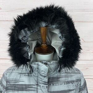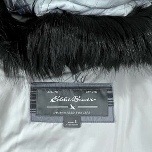 Eddie Bauer Lodge Serape Aztec Ombre Quilted Goose Down Puffer Hooded Parka Coat. A bestseller for more than a decade, this parka has a storm repel water repellent polyester shell and is insulated with 650 fill Premium Down for exceptional warmth without weight or bulk. 80% Down Fill. Unique rectangular quilting creates a more sleek silhouette. Detachable hood and faux fur trim with a fleece lined mock neck. Double placket in front, zip and snap closure. Inside pocket. Fleece lined zip pockets at the side. In excellent condition. Size Small.