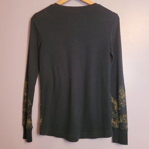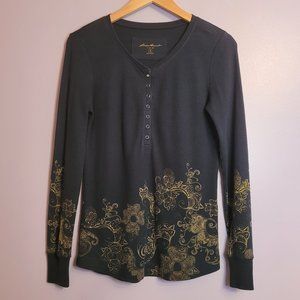 Eddie Bauer long sleeve top. Thermal style material. 6 buttons down front. Gold paisley print on the bottom half.