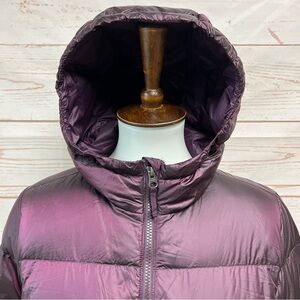 Eddie Bauer Luna Peak Iridescent Eggplant Purple Waterproof Down Puffer Hooded Parka Coat. 550 Down Fill with a hood. Storm Repel durable water repellent finish. Bi-directional front zip closure. 550 Responsible Down Stardard certified padding. Down insulation, Side pockets with zip, Inside zip pocket. Classic universal fit. Not too slim, not too relaxed on body. Designed to fit over midweight layers.
