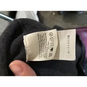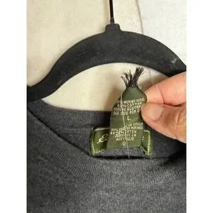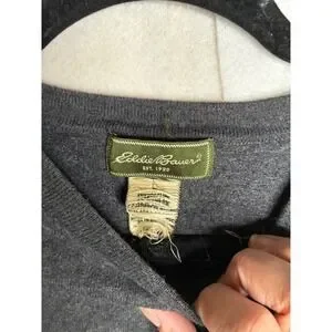 Eddie Bauer crewneck sweater crafted from a soft blend of 55% Merino wool and 45% cotton. This charcoal gray knit features a classic raglan sleeve design and ribbed trim at the neckline, cuffs, and hem for a comfortable, timeless fit. Made in Australia, it offers a mid-weight feel suitable for layering or solo wear. Note that there is a small snag/hole on the sleeve as shown in the photos.