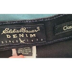 The product is a pair of Eddie Bauer men's classic fit black jeans in size 32x30. Made from a cotton blend denim fabric, these jeans feature a zip closure and a straight leg style. With a timeless classic fit and a regular size type, they are ideal for everyday wear. The black color and durable material make them versatile and suitable for various occasions. Perfect for the man looking for comfort and style in their wardrobe.