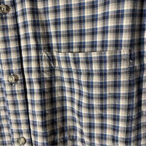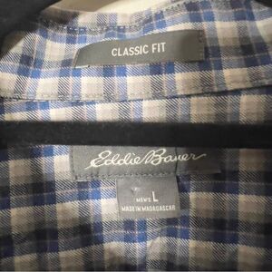 Eddie Bauer Men’s Classic Fit Plaid Flannel Button Down Shirt. Size Large. Blue, beige/tan in color. Soft lightweight flannel feel. One front chest pocket. Excellent used condition.