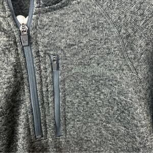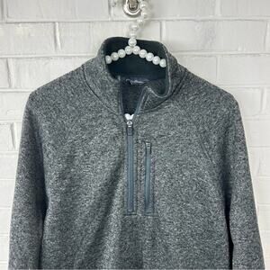 Good pre worn condition. Lightweight pullover knit fleece/ sweater. Has a partial zip. Front zip pocket. Grey brown like color. Great style for layering or any weather really. All sales final.
