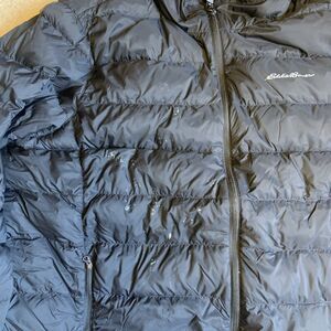 The Eddie Bauer Men's Down Hooded Jacket in Stratuslite Hoodie Black is a stylish and practical outerwear option for men. Made with a durable nylon outer shell and lined with cozy nylon, this solid black jacket features a zip closure, hood, and logo accents. Perfect for casual occasions in the winter, fall, or spring, this puffer jacket is designed for comfort and functionality. With a 2XL size and classic American-themed design, this Eddie Bauer jacket combines quality craftsmanship with a timeless style.