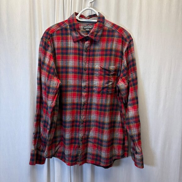Featuring a classic plaid pattern in red, gray, and blue, this long‑sleeve button‑down shirt offers a relaxed, outdoor‑ready fit. Crafted from soft, mid‑weight cotton blend flannel.