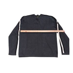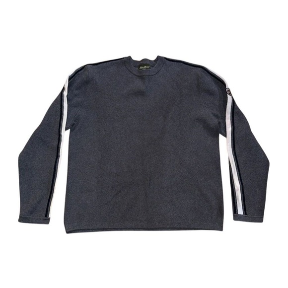 Keywords: Eddie Bauer, men's sweater, pullover, gray sweater, crew neck, long sleeve, striped detailing, fall fashion, casual wear, knit sweater, cotton sweater, machine washable, classic fit, pre-owned.
