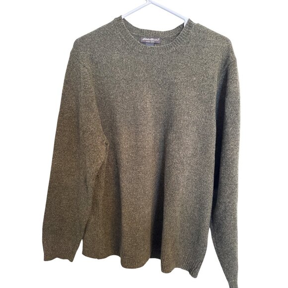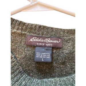 Eddie Bauer Mens Green Sweater L Crewneck Lambswool Pullover Warm Soft FLAW