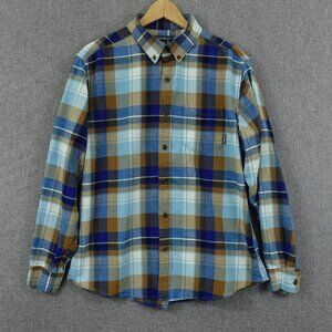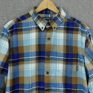 Eddie Bauer Men’s L Flannel Shirt Blue Brown Plaid Button Down Long Sleeve