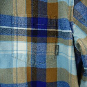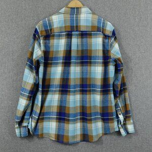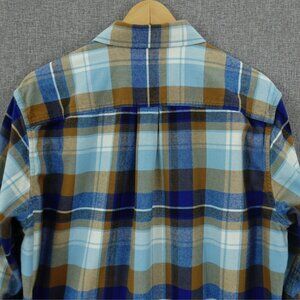Description: This Eddie Bauer men's flannel shirt in size L features a bold blue and brown plaid pattern with a classic button-down collar and single chest pocket. Soft and warm, it's perfect for layering on cool days or wearing solo for a rugged, casual look. Button closures are sturdy and the fabric is thick without being bulky—ideal for fall and winter.