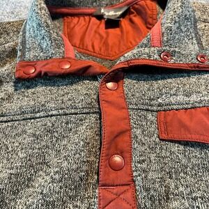 Keywords: Eddie Bauer, mens sweater, pullover, fleece sweater, mock neck, button sweater, gray sweater, casual sweater, outdoor wear, transitional weather, pocket sweater, mens clothing, size large, L