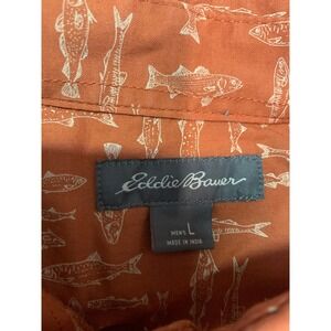 Keywords: Eddie Bauer, men's shirt, button down shirt, short sleeve shirt, fish print, orange shirt, casual shirt, fishing shirt, outdoor shirt, men's clothing, size L, preppy, nautical, coastal, summer shirt
