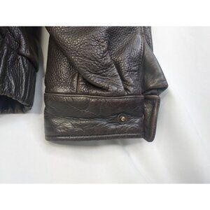 This Eddie Bauer leather jacket offers a classic and timeless aesthetic. Crafted from high-quality leather, it provides warmth and durability, making it suitable for various occasions. Its brown color complements casual and outdoorsy outfits.