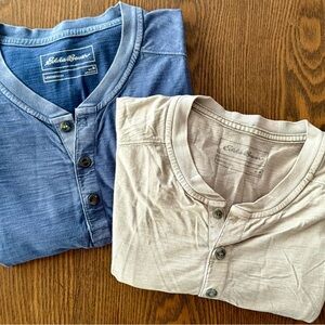 Bundle and save big! Two soft, cozy Eddie Bauer Legend Wash Henley shirts (Men’s Medium) — one navy blue, one tan — both in excellent condition.