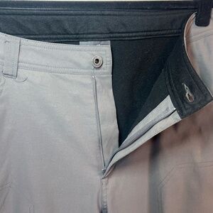 Eddie Bauer Nylon Fleece Lined Pants Gray with Black Inner Fleece Lining Button Zip Closure Front Slash Pockets Back Hook & Loop Closure Pockets Side Leg Zip Pocket Straight Leg Belt Loops Water Repellant UPF 50 Sun Protection Outdoor Winter Hiking Camping Cozy