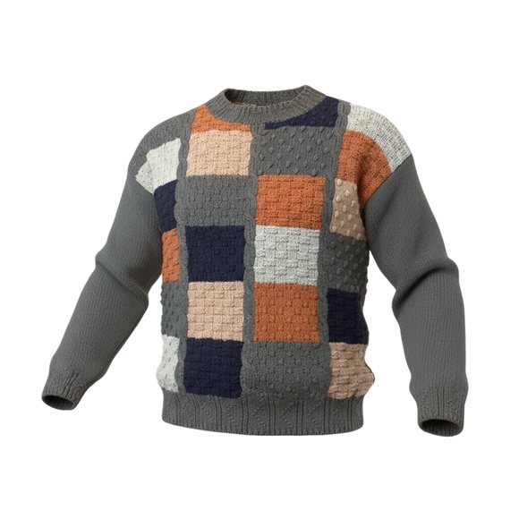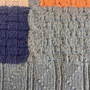Stylish patchwork design. Cozy crewneck fit. Perfect for casual wear. 1991 season. Very bulky knit mixture of cable and popcorn. Great color blocking. Does not fit snug. More oversize. EUC. No holes, tears, snags, stains. Steam refreshed
