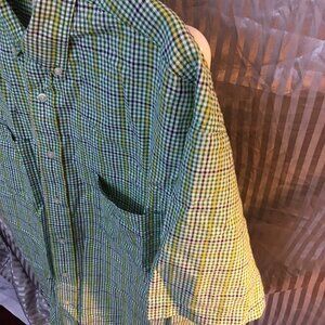 Selling a used Eddie Bauer Men's Plaid Short Sleeve Button Down Shirt in great condition no rips or stains needs a good Ironing :). Shirt is made off 100% Cotton and is machine washable. Size is Large and color is Green,white, yellow & blue.