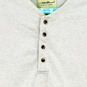 This Eddie Bauer Henley shirt combines comfort and style, crafted from 100% cotton for softness and breathability. The classic grey beige tone and buttoned placket add a timeless touch, making it versatile for various occasions. Ideal for layering or standalone wear, it offers both aesthetic appeal and practical functionality.