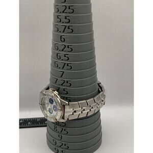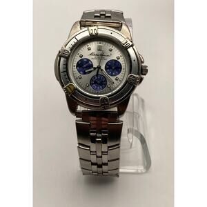 This Eddie Bauer men's quartz watch is a stylish and functional timepiece. With a 39mm case, it features a new battery and a LG 3-eye multifunction display. The watch is water-resistant and has a day-date function. The silver and blue tones give it a sophisticated look. Get ready to elevate your style with this fantastic watch!