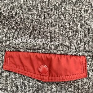 Eddie Bower heather gray fleece sweater with breast pocket, and two pockets in the front. Button three quarter closure with maroon accents.