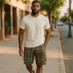 Upgrade your wardrobe with these Eddie Bauer men's shorts, size 34 in a stylish olive green and tan plaid pattern. These shorts feature heavy cargo pockets, perfect for carrying your essentials while on the go. The flat front and mid-rise add to the overall comfortable fit, while the zip closure ensures a secure fit. Crafted from high-quality cotton and woven fabric, these shorts are machine washable and easy to care for. The 11-inch inseam makes them suitable for summer, fall, and spring seasons. These cargo shorts are perfect for any occasion and are sure to become a staple in your wardrobe.