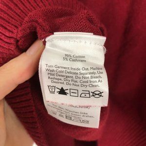 Men's red cotton and cashmere blend v-neck knit sweater. V-neckline, long sleeves, knit construction. Ribbed trim, pullover styling.
