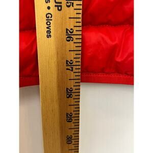 The vest is a men's size XL and comes in a vibrant red color. It has a full zip-up front and is lightweight and packable, making it ideal for travel or outdoor activities.