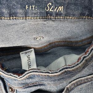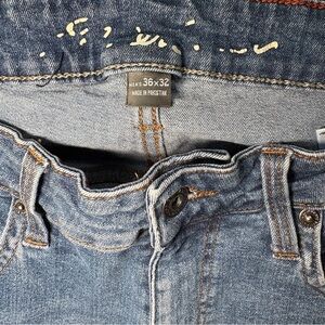 Essential medium-wash slim jeans with a straight leg—easy, classic, and perfect for fall. 5-pocket design, zip fly, leather logo patch. Tagged 36x32. Gently worn, no flaws noted. Style with flannels, hoodies, or boots.