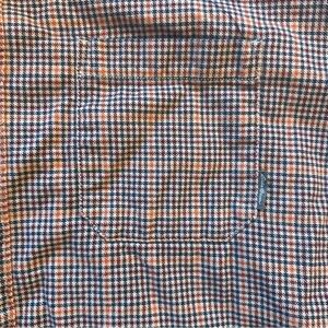 Eddie Bauer Men's Orange, Blue, Maroon, and Beige Houndstooth Check Long Sleeve Shirt.