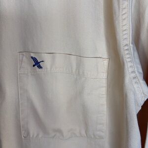 Eddie Bauer button-down shirt. Has a collared neckline, button front closures, left chest pocket, long sleeves with button cuffs, back yoke, and shirttail hem. Made of 100% Cotton. Style # RN 2843. Machine Wash Warm Excellent condition, no flaws From shoulder to bottom hem 33”From armpit to armpit 26” Sleeves 25” Measurements are approximate and laying flat.