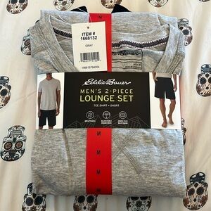 New with tag Eddie Bauer 2 piece lounge set Crew neck with short sleeve t-shirt Shorts: adjustable waistband, side pockets Color: top: gray / shorts: dark blue Size: M 60% Cotton 40% Polyester