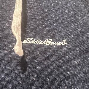Stylish Eddie Bauer hoodie in navy blue. Features a comfortable fit with a front pocket and drawstring hood.