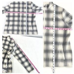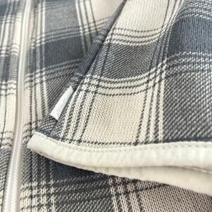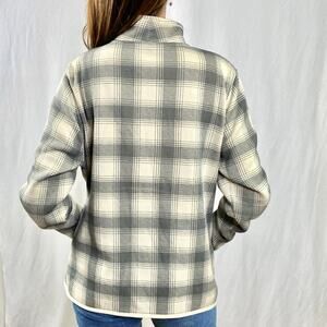 Eddie Bauer Neutral Plaid Full Zip Fleece Jacket in good condition. Desaturated grey and cream hues. 100% polyester. Loved and worn. Flaws include light threading. Little to no pilling. Tagged XL.