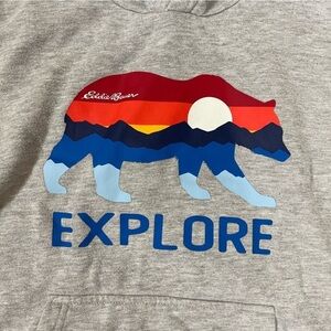 Eddie Bauer size small 7/8 bear graphic. Light staining on sleeves shown in close up photo. No holes or tears!