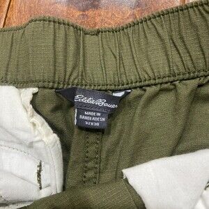 These Eddie Bauer Olive Green Chrino Pants are an excellent choice for versatile and comfortable wear. Made with an elastic waist for a perfect fit, the pre owned pants are in good condition and available in Women's size 32 x 30.