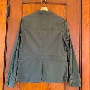 This utility jacket is in great shape! It is extremely durable and is an olive tone— perfect for fall. It is a bit oversized, so I think it would work for either a small or medium. For fit reference, I am a 35 bust, 28 waist, and 37 hip. Let me know if you have any questions!