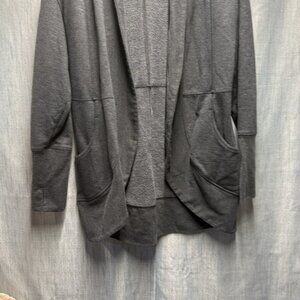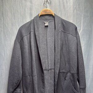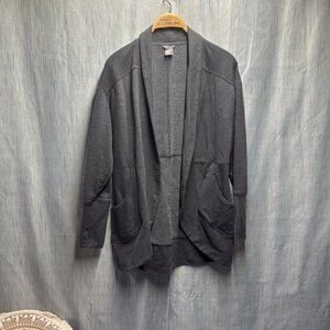 Stylish gray open front cardigan with pockets. Perfect for layering.