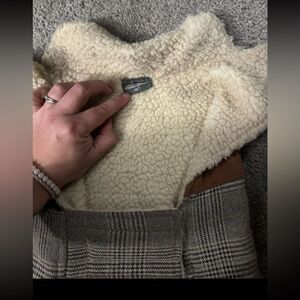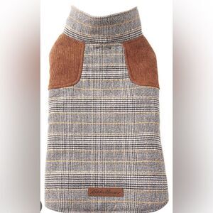 Classic brown and tan plaid field coat with corduroy shoulder accents. Poly Fill, faux wool lining. Belly and neck hook and loop closure for adjustability. Stylish standup collar. Faux suede Eddie Bauer label. Easy Access leash open. 100% Polyester. Machine wash cold, tumble dry low or hang dry.