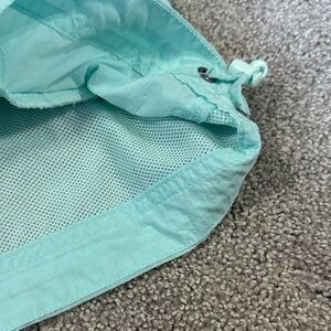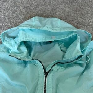 Stylish aqua windbreaker by Eddie Bauer. Lightweight and perfect for rainy days. Features a hood and front zipper. Mesh lining, lightweight, draw cords at bottom for adjustment, hood rolls up if not using, jacket folds into crossbody bag via a zipper pocket located on back for easy packing or carrying around, perfect travel windbreaker