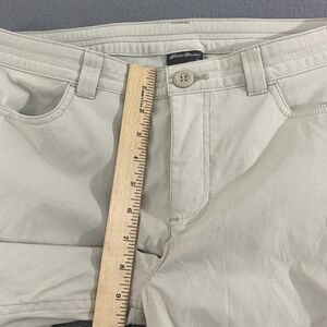 Details: Zip fly with button closure; belt loops; front hand pockets; right thigh zip pocket with EB logo tag; Eddie Bauer script logo at back waist