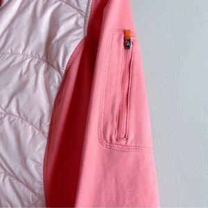 Zip Up Hybrid Jacket by Eddie Bauer, featuring a rain resistant hoodie rolled into the stand-up collar, lightweight soft fleece-like material with thin puffy front panel to keep the core warm, zipper front closure, zip-up pockets front, zip-up small pocket on left arm, fitted style. Color: pink.