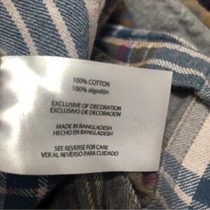 Brown, tan, blue, red, white,one chest pocket, button cuffs, curved hem, colors may vary due to lighting, good used condition, Sz XL