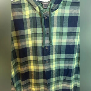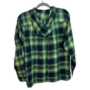 Pre owned like new. Really nice green and blue plaid hooded pullover. Buttons halfway down. This is super soft! Perfect for a hike and the outdoors in the fall. Womens size small.