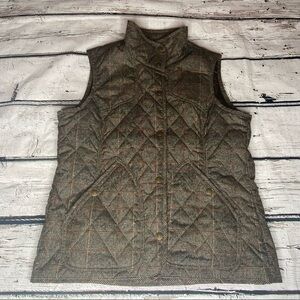 In excellent condition. 100% polyester. Brown plaid polyester vest with collar and pockets size TL. Snaps down front and on back for adjustable waist. Lined in dark brown.