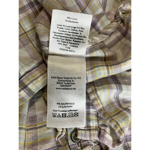 A charming and feminine plaid blouse from Eddie Bauer featuring delicate ruffle and lace details along the button placket. This lightweight cotton shirt combines classic outdoor style with refined feminine touches, perfect for casual weekends or relaxed office settings.