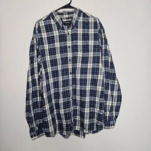 This is a long sleeved button down shirt by Eddie Bauer. It has blue, cream, black, and yellow plaid print. There are extra buttons sewn on to the bottom of the button panel, as shown in the photos. Note that this shirt is longer in the back than in the front.