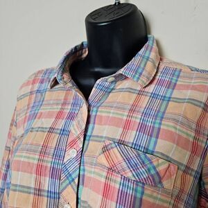 This is a long sleeved button up shirt by Eddie Bauer. It is orange, peach, blue, and green plaid. There are pockets on the chest and extra buttons attached to the inner tag.