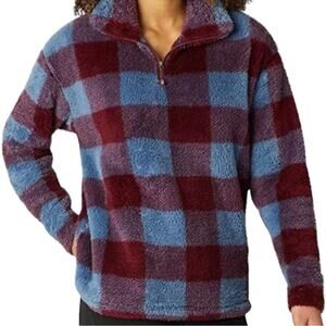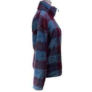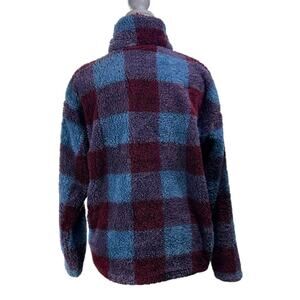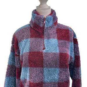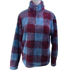 Eddie Bauer Plush Fleece 1/4 Zip Mock Neck Check Pullover Blue Maroon Size Med