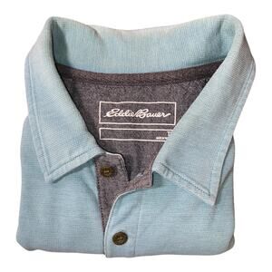 The product is a men's Eddie Bauer polo shirt in size large, featuring a solid blue color with short sleeves. Made from spandex material, this polo is designed for regular size men looking for a comfortable and stylish shirt option. Eddie Bauer's quality construction ensures durability and a classic look that is perfect for everyday wear.